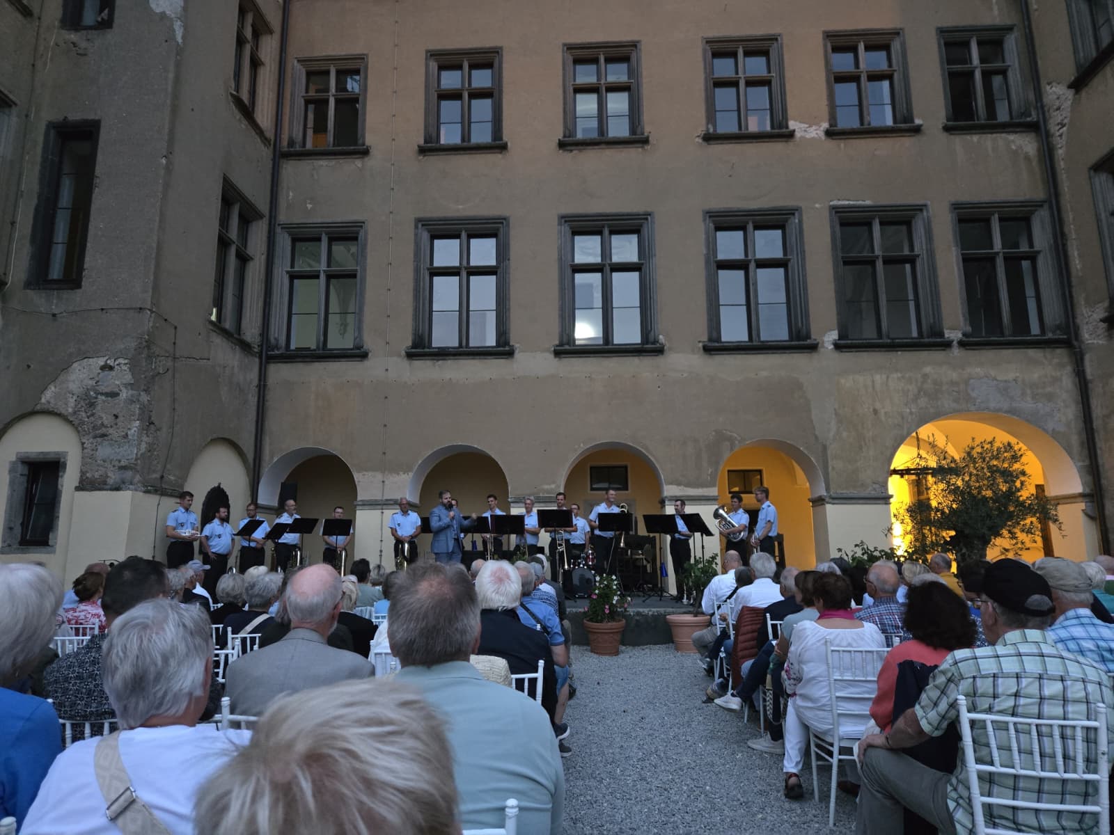 Vor der eindrucksvollen Kulisse des Schlosses bot das Heeresmusikkorps ein abwechslungsreiches Programm, das von klassischen Märschen über sinfonische Blasmusik bis hin zu modernen Arrangements reichte. Das Publikum zeigte sich begeistert und würdigte die musikalische Darbietung mit langanhaltendem Applaus.